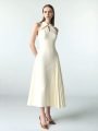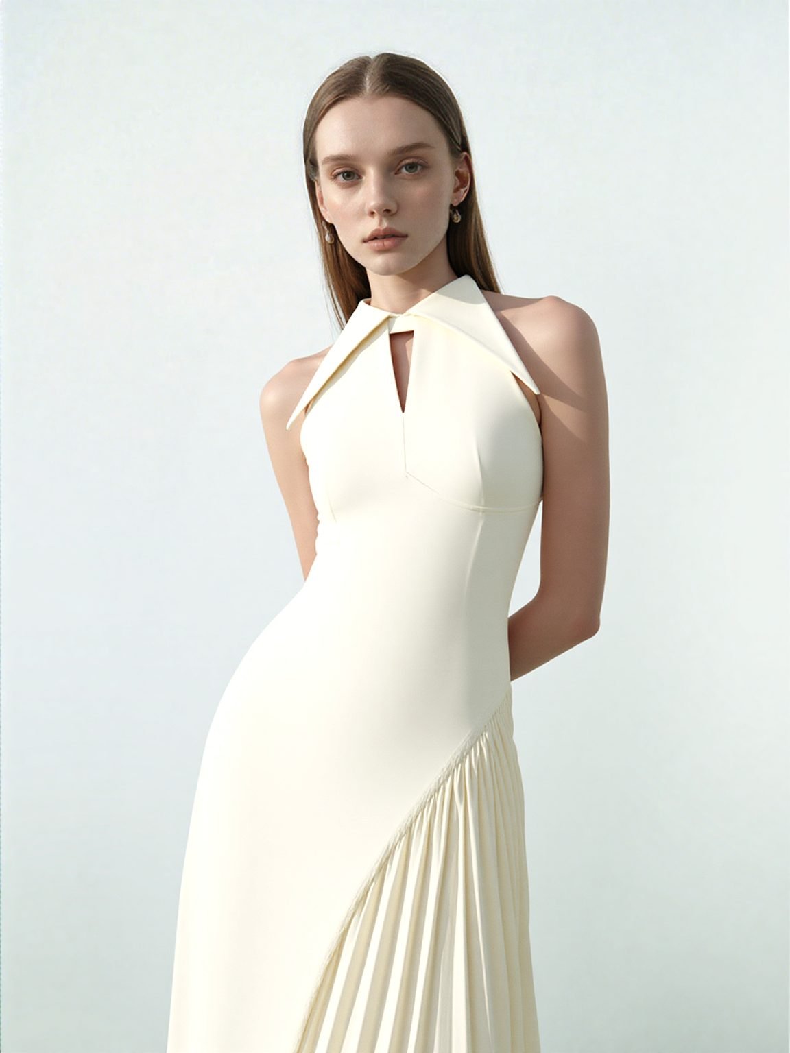 Refined elegance in motion, this ivory midi dress features a sculptural collar, a subtle keyhole detail, and an asymmetrical pleated panel for a timeless yet modern silhouette.